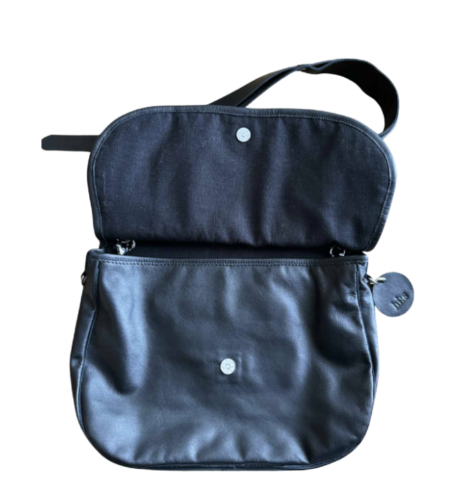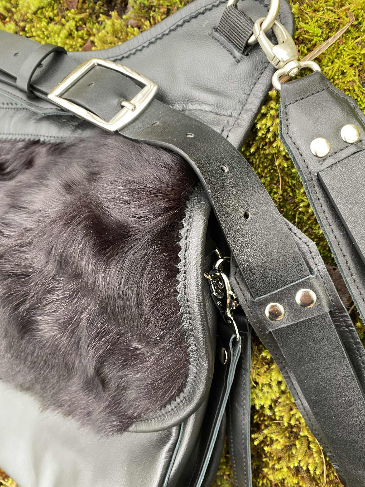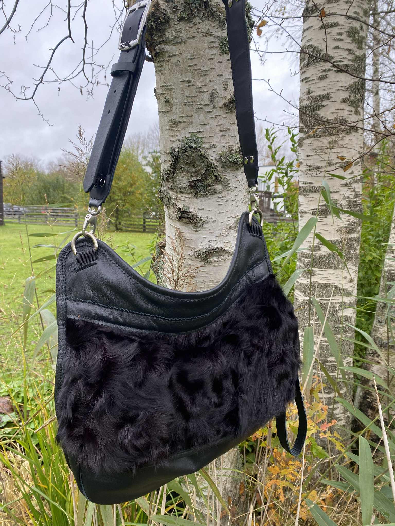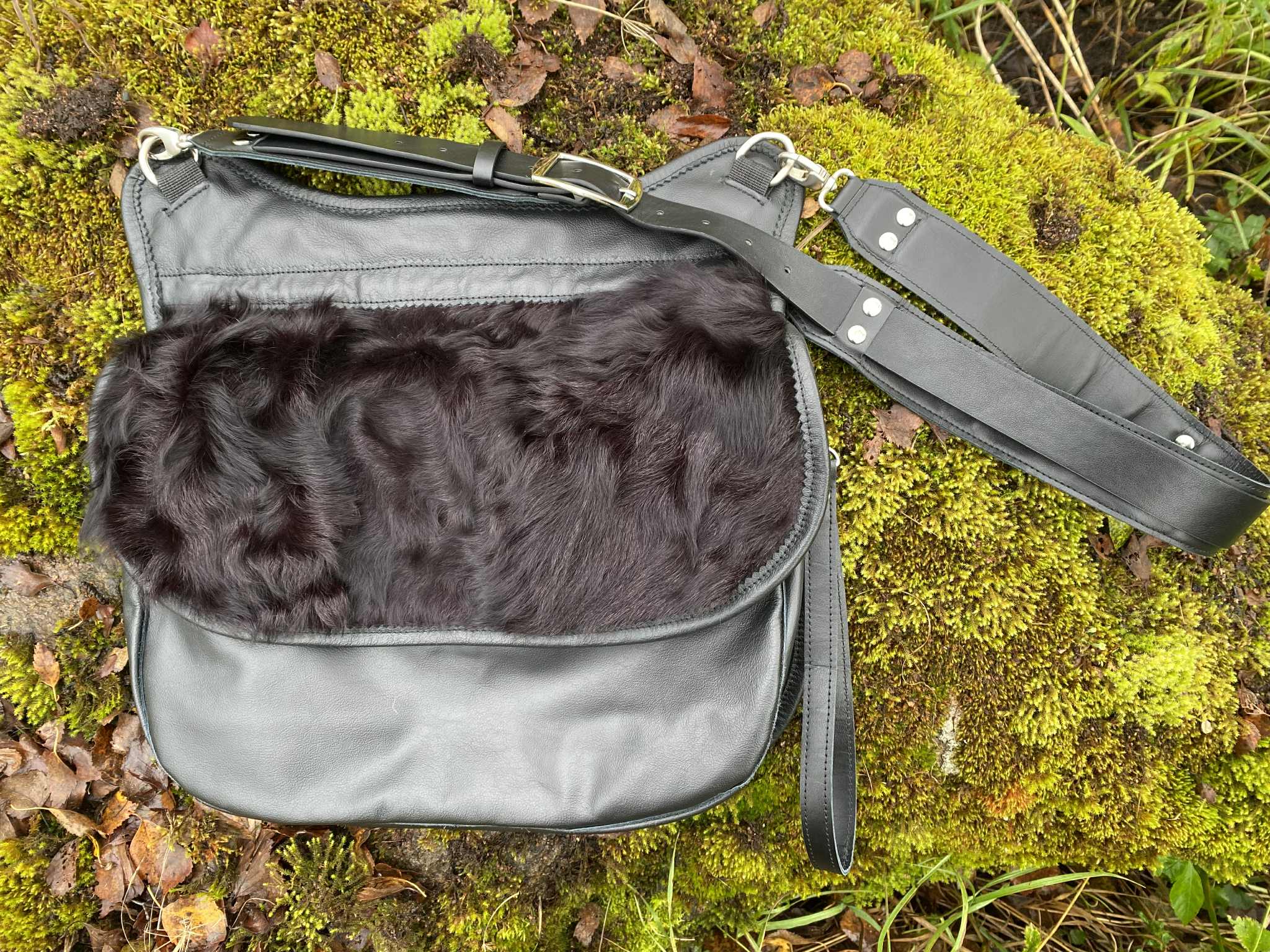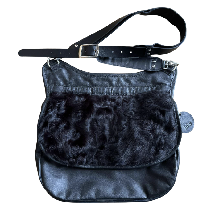 Taaskasutusmaterjalidest valmistatud kroomparknahast õlakott laiusega 37 cm ja kõrgusega 30 cm. Õlarihma pikkus on reguleeritav (90 cm-110 cm). Koti klapp kinnitub magnetiga. Koti sees on must vooder (100% ramjee). Koti klapi all asub karabiinidega soovi korral eemaldatav ramjee kangast lisa kott, mille saab voltida koti sisse või kanda eraldi kandekotina kasutades kaasas olevat nahast rihma. Koti sees asub nahast tasku. Koti klapp on pealt kaunistatud karusnahast detailiga, mis on välja lõigatud mägikitse nahast kasuka detailidest. Koti rihma valmistamisel on kasutatud taaskasutus püksirihma. Koti rihma saab soovi korral kasutada ka vööl.